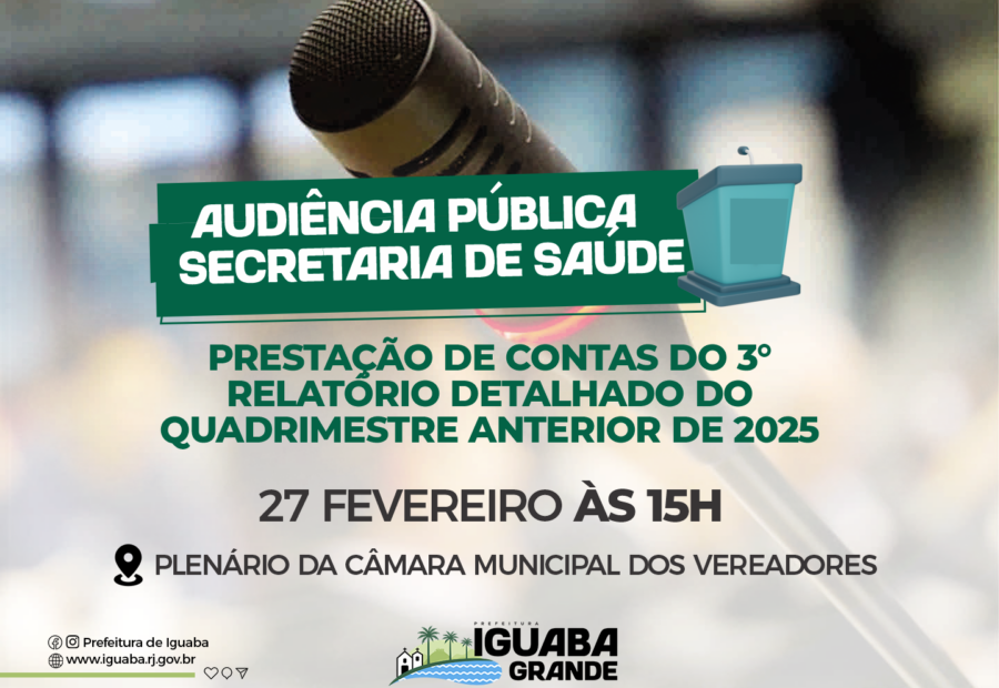 Prestação de contas do 3° relatório detalhado do quadrimestre anterior de 2025. 27 Fevereiro às 15h. Local: Plenário da Câmara Municiapal.